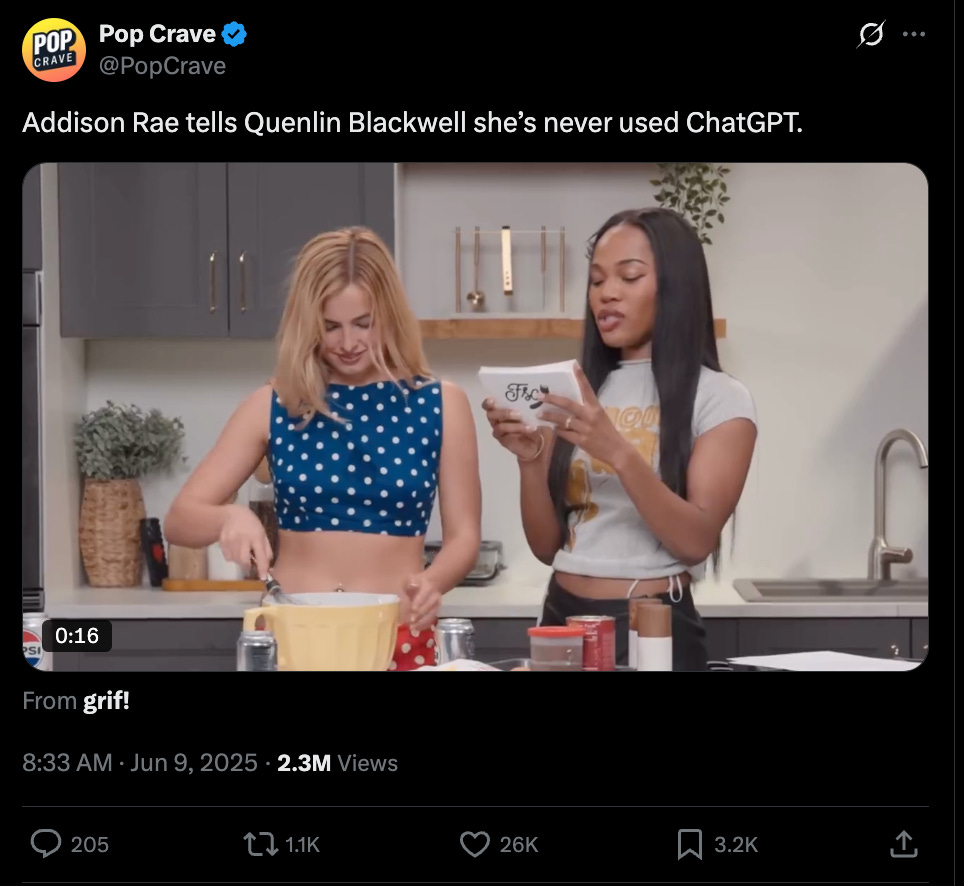 The Tiktok start turned pop artist Addison Rae has never used ChatGPT. Nice. (X)
